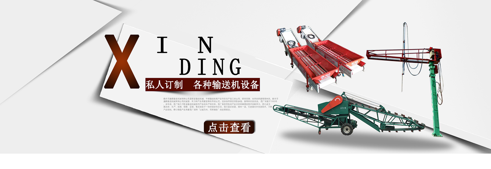 衡水市鑫鼎輸送機(jī)械有限公司是糧食輸送機(jī)械、平板輸送機(jī)等產(chǎn)品專業(yè)生產(chǎn)加工的公司,擁有完整、科學(xué)的質(zhì)量管理體系。衡水市鑫鼎輸送機(jī)械有限公司的誠(chéng)信、實(shí)力和產(chǎn)品質(zhì)量獲得業(yè)界的認(rèn)可。歡迎各界朋友蒞臨參觀、指導(dǎo)和業(yè)務(wù)洽談。 我廠創(chuàng)建于1980年,多年來(lái),我廠致力于糧食輸送機(jī)械系列產(chǎn)品的生產(chǎn)和開(kāi)發(fā)。我廠具有優(yōu)良的產(chǎn)品開(kāi)發(fā)和雄厚的技術(shù)創(chuàng)新實(shí)力,使之成為集科研、生產(chǎn)、檢測(cè)、銷售、安裝、售后服務(wù)于一體的綜合性企業(yè),我們追求卓越,崇尚一流,引進(jìn)國(guó)內(nèi)外先進(jìn)技術(shù),不斷產(chǎn)品結(jié)構(gòu),精心鑄造產(chǎn)品質(zhì)量我廠堅(jiān)持“以誠(chéng)為本,優(yōu)質(zhì)服務(wù)”的經(jīng)營(yíng)理念。。積極拓展市場(chǎng),贏得了廣大客戶的信賴和一致好評(píng)。產(chǎn)品暢銷山西、山東、遼寧、黑龍江、吉林、北京、天津、內(nèi)蒙古等28個(gè)省、市、自治區(qū)。